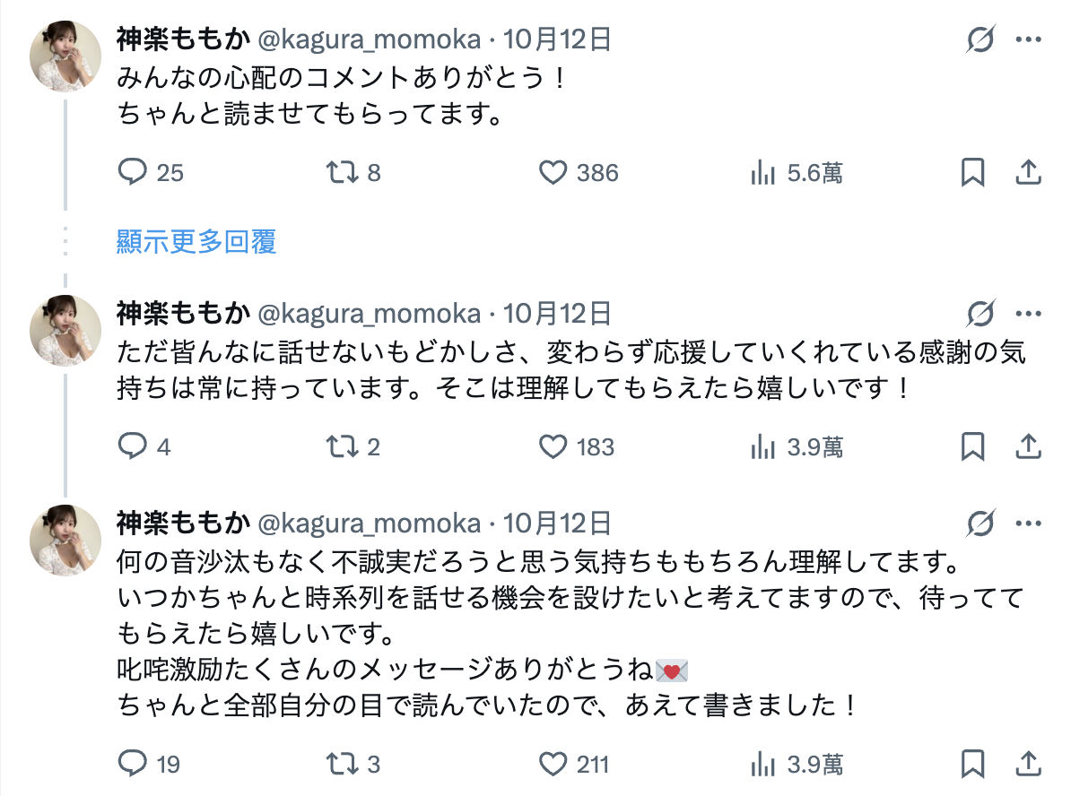 好像说了些什么又好像什么都没说对吧?这就是日本人的语言艺术,不过就我的看法,神楽ももか(神乐桃果)确实有事,而且到目前为止并没有解决,所以她卡住了,片子发不出来甚至就连社群也不好更新⋯
