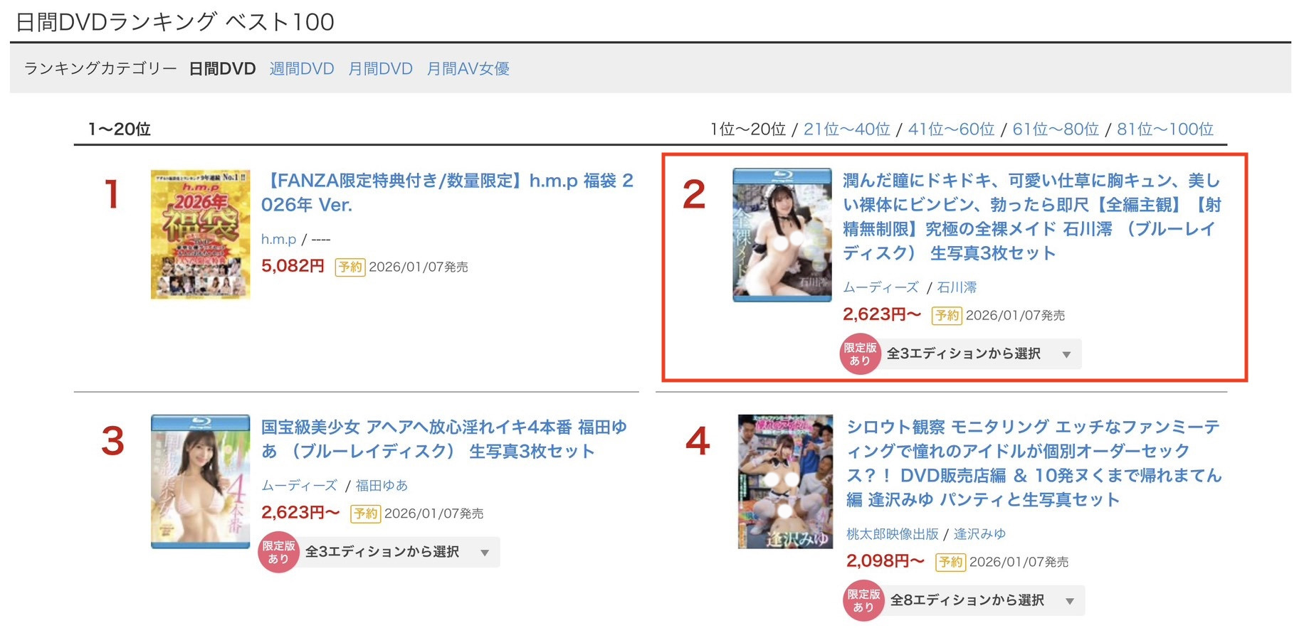 扣掉福袋,在2026年1月公布的第一档作品www.hinku.com,在FANZA实体片通贩片,石川澪勇夺第一!很文博客-https://www.hinku.com/83513.html
