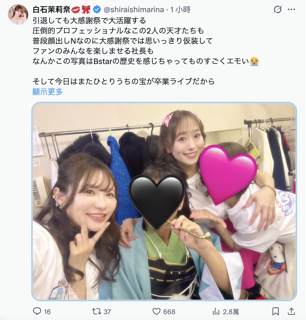 这是经纪公司BStar大感谢祭的后台,在这个秀肌肉的场合照理来说大家都盛装出席、想尽办法争奇斗艳才是,所以白石妈妈把人家的脸遮起来的动作真的非常奇怪,是什么原因让这两个女孩不能露脸?很文博客-https://www.hinku.com/86071.html