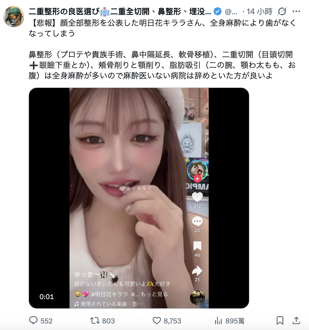 然后马上就有整型医生说了(https://x.com/gankenkasui05),明日花キララ(明日花绮罗)的症状是因为整型时接受全身麻醉的后遗症,这位医生呼吁,整型时选择有合格麻醉医师的诊所真的非常重要⋯很文博客-https://www.hinku.com/86744.html