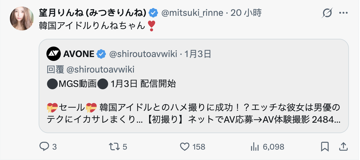 应该有些人反应过来了,望月りんね(望月凛音)?她不是在Ideapocket(IP社,アイポケ)于去年6月出道、号称又可爱又漂亮又敏感的新生代女优吗?怎么会到了MGStage这个串流平台变成韩国偶像?答案很简单,那就是望月りんね(望月凛音)不再是Ideapocket的一员,双方合作只到去年11月为止,而且在Ideapocket在社群上发表的贺岁图卡上也找不到她的身影,就是被蛋雕惹〜