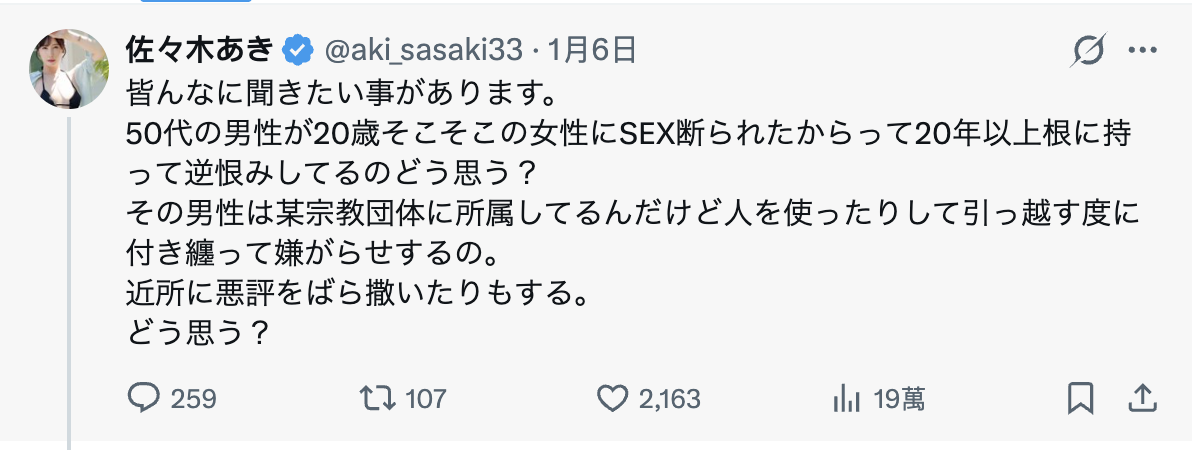 前天(1/6),这位不久前才复活的美丽熟女在社群(https://x.com/aki_sasaki33)公布了一段长久以来困扰自己的事,我直翻如下:很文博客-https://www.hinku.com/87487.html