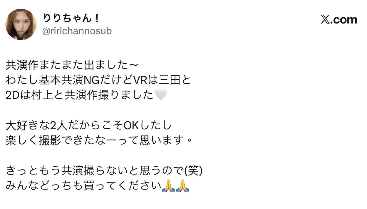 当然不是因为这次合作的经验不开心,她可是很开心地和村上合作榨干了两位男优的蛋药库,她说自己本来就不爱共演,之前和三田真铃一次,这次和村上悠华又一次,纯粹是和两人的交情不一般,所以很开心地接下了这个Offer,未来她应该不会再拍了⋯