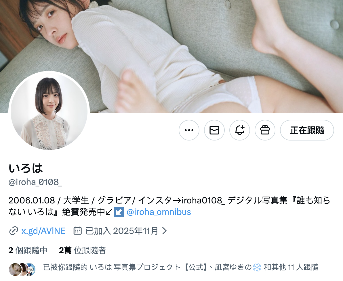 她的X(https://x.com/iroha_0108_)上线很久了,大家赶快追起来,如果方便的话,IG(https://www.instagram.com/iroha0108_/)也顺手按下追踪,根据社群的资料,2006年出生、目前才20岁的她还是个大学生,学的是法律,去年年底的时候以写真女星的身份在週刊Playboy(プレイボーイ)登场,后来另外注册了一个帐号促销她的写真集「誰も知らない」,前几天还进行了直播: