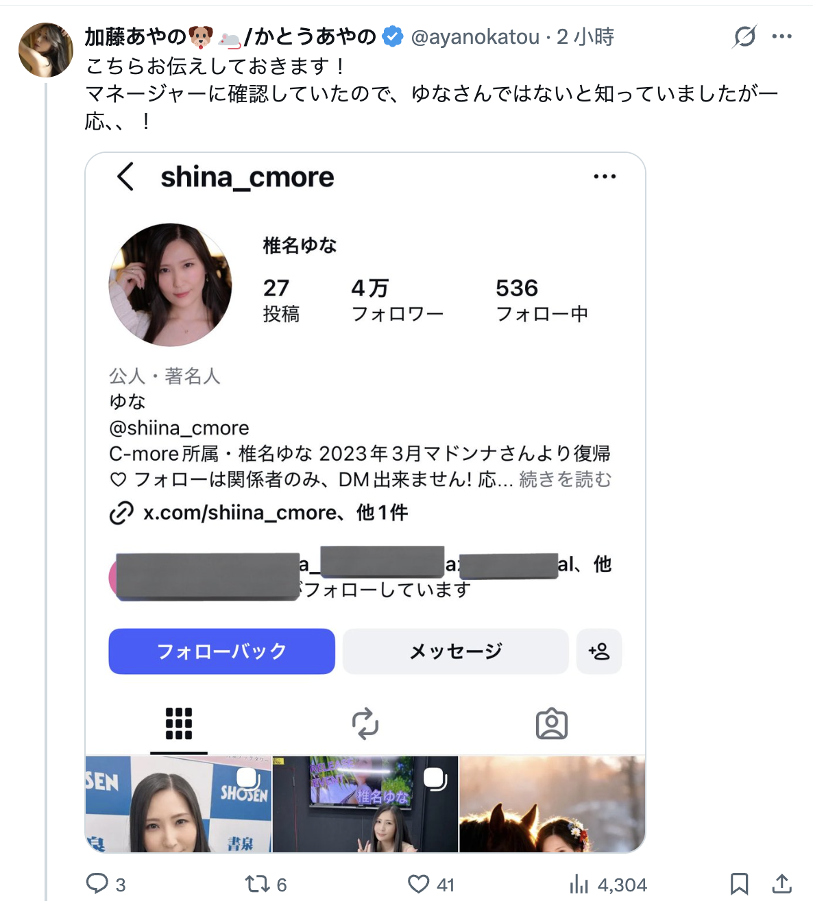 这篇发文马上就引来了同事务所的女优「加藤あやの(加藤绫乃)」留言,她说已经和经纪人确认了,那个IG确实是假帐号,会帮忙扩散出去〜