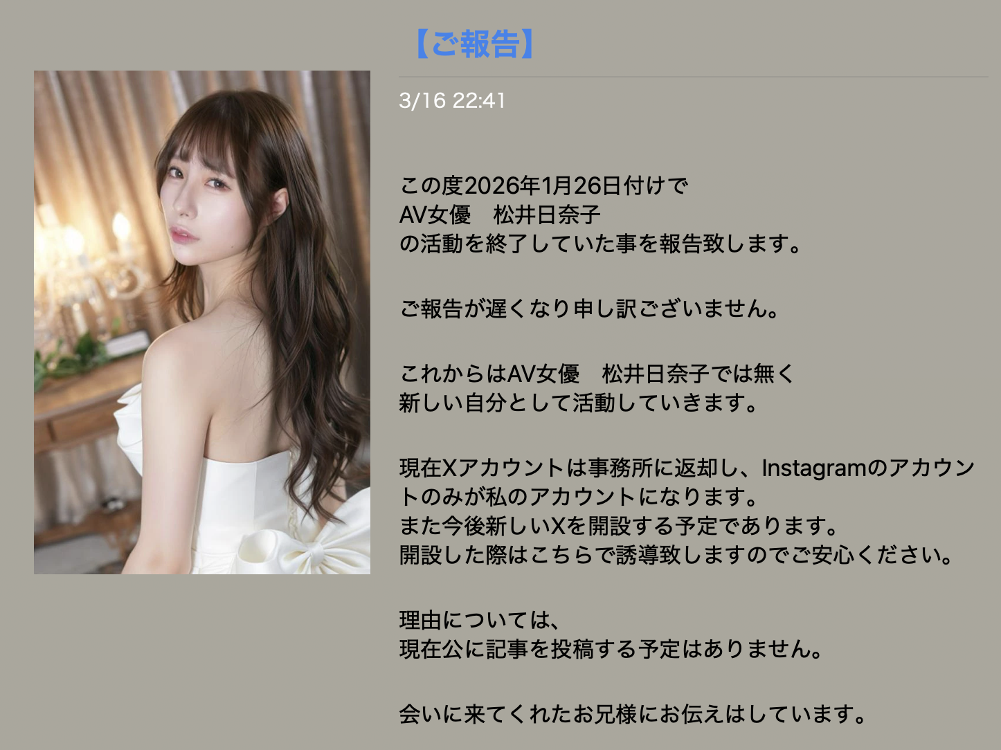 松井日奈子表示不打算公开说明,不过如果你去风俗店找她就会讲,就看有没有人想去挑战?但不管理由为何,松井日奈子说了,真心感谢支持自己的粉丝,也非常感谢AV这分工作: